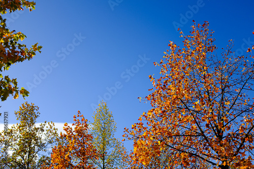 Fototapeta premium Brown and orange leaves on a tree branches on a solid blue sky background
