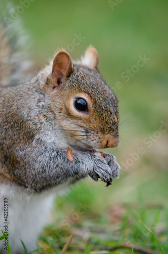 Obraz premium Brown and red squirrel eating an almond in close-up