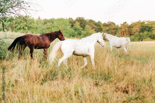 Fototapeta premium Brown and white horses on a meadow in the morning