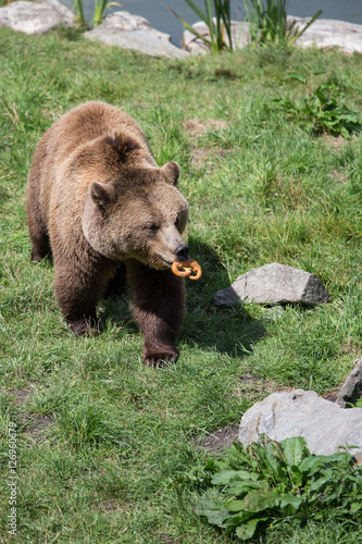 © wagner_md, Fototapeta premium Brown Bear carrying Pretzel, Bavaria, Germany