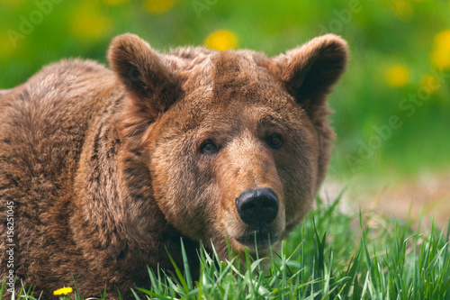 © kwadrat70, Naklejka premium Brown bear close up portrait on green meadow
