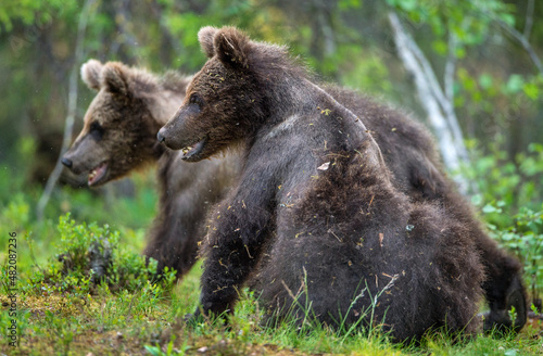 © Uryadnikov Sergey, Fototapeta premium Brown bear cubs in summer forest. Scientific name: Ursus Arctos Arctos. Wild nature, Natural habitat.