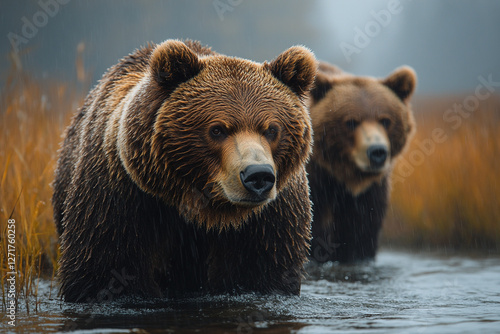 Fototapeta premium Brown Bear Duo, A Serene Encounter in the Misty Wilderness