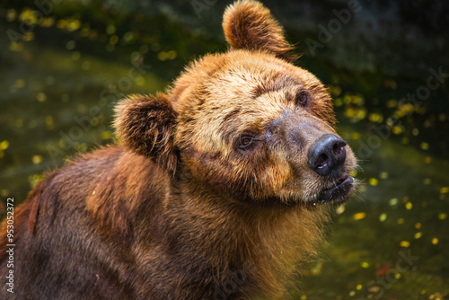 Obraz premium Brown Bear face close up, fur wet and matted, with a sad expression, gazing...