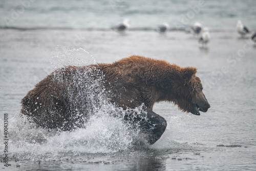 Obraz premium Brown bear hunts for salmon in Kamchatka, Russia