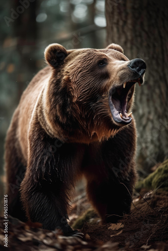 © Roman, Fototapeta premium Brown bear in the wild. Kamchatka Forest. Wild Grizzle bear roaring aggressively running towards camera generative ai
