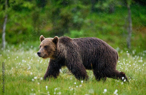 Fototapeta premium Brown bear is walking through a forest glade. Close-up. Summer. Finland.