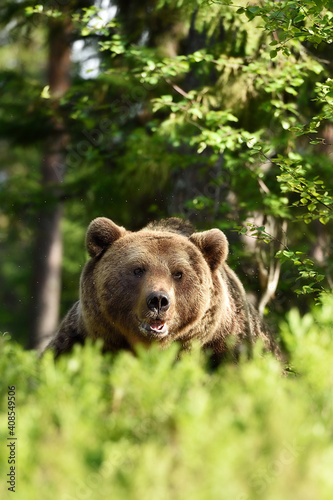 Fototapeta premium brown bear portrait in sunny forest at summer