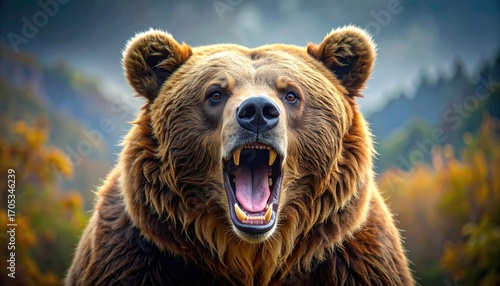 © wawan, Fototapeta premium Brown Bear Roaring Aggressively Close Up with Open Mouth and Sharp Teeth Forest Backdrop in Soft Focus