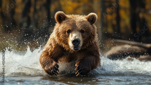 Obraz premium Brown bear running through river water