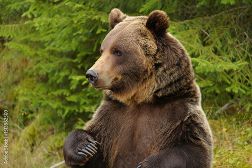 © Dejana, Obraz premium Brown bear sitting erect showing claws in forest