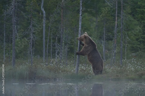 Obraz premium Brown bear standing in the misty forest at twilight