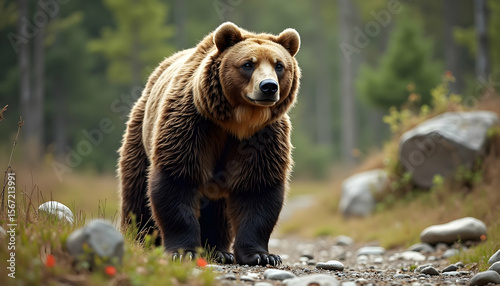 © elyf, Obraz premium Brown Bear Standing on Forest Path Surrounded by Trees