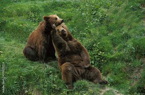 © slowmotiongli, Fototapeta premium Brown Bear, ursus arctos, Adults playing in a Funny Posture