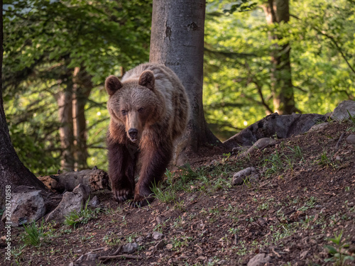 © Peter, Obraz premium Brown bear (Ursus arctos) in summer forest by golden hour. Brown bear in evening forest by sunset.