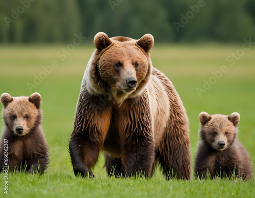Naklejka premium Brown bear, ursus arctos, mother with two cubs on green meadow with copy...