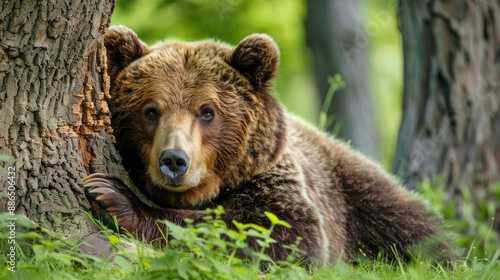© Santy Hong, Obraz premium Brown bear (Ursus arctos) resting under a tree, with a peaceful expression
