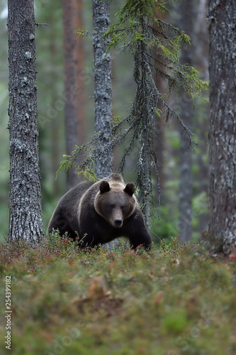 © Erik Mandre, Fototapeta premium Brown bear walking at nigh in the forest
