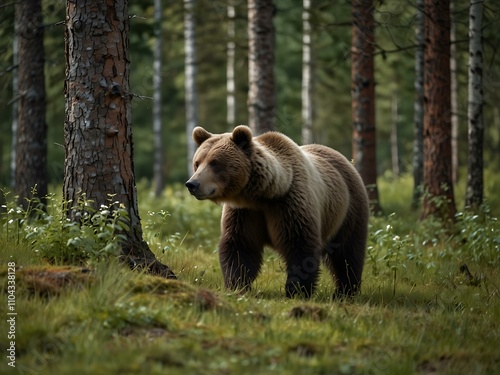 © claudunia, Obraz premium Brown bear walking through a forest glade, summer in Finland.