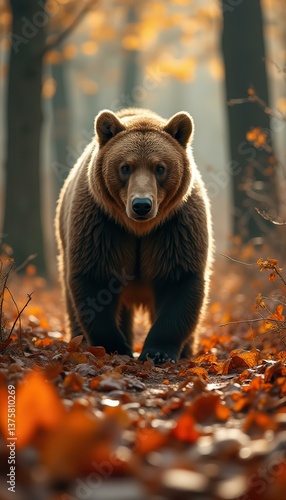 Fototapeta premium Brown bear walking through the autumn forest, illuminated by sunlight, with...