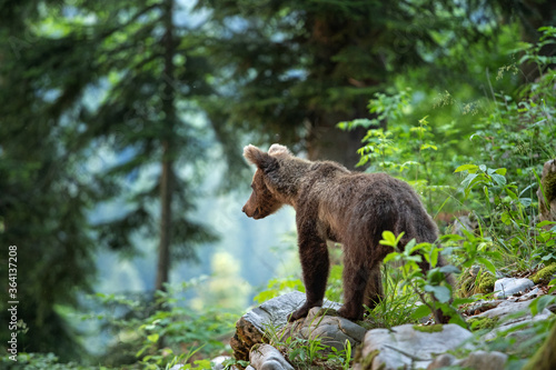 © prochym, Obraz premium Brown bears in the forest. European bear moving in nature. Brown bear from Slovenia. Wildlife walking in nature. Bear in wildlife. Small bears in the forest. Spring in nature.