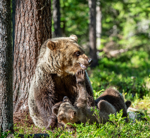 Fototapeta premium Brown bears. She-bear and bear-cubs in the summer forest. Green forest natural background. Scientific name: Ursus arctos.