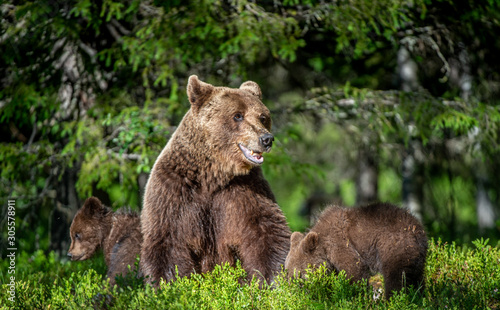 Fototapeta premium Brown bears. She-bear and bear-cubs in the summer forest. Green forest...
