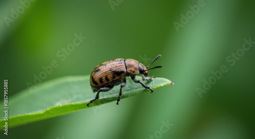 Fototapeta premium Brown Beetle on Green Leaf Closeup.