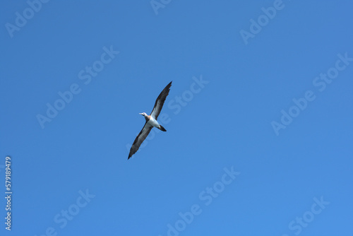 Obraz premium Brown booby circling on a clear sky