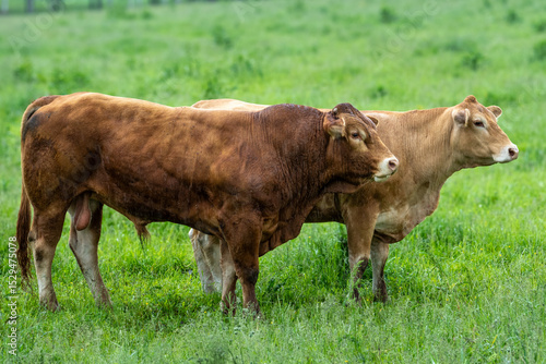 © Edijs, Fototapeta premium Brown Bull and Cow Standing in Green Pasture – Rural Cattle Breeding Scene