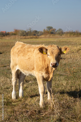© Levtrona, Fototapeta premium brown calf pasture on a meadow looking at camera