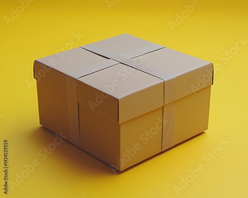 © Bene, Obraz premium Brown cardboard box with tape on a vibrant yellow background, ideal for packaging