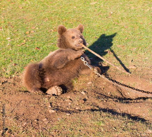 © Andrey Solovev, Obraz premium brown circus bear plays with a wooden stick sitting on the chain