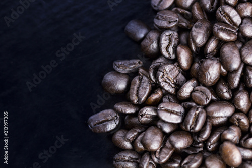 © Michael Sapryhin, Naklejka premium Brown coffee beans on black surface. Top view close up.