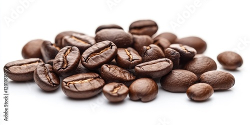 © Kamal, Naklejka premium Brown coffee beans scattered on a white background, shallow depth of field enhancing their rich texture, ample space for text placement.