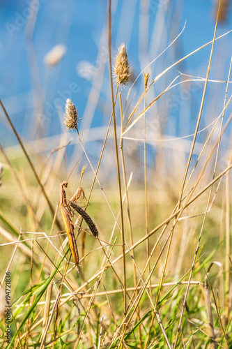 © Stanislava, Fototapeta premium Brown colored adult male European mantis camouflaged in grass on the Bulgarian sea-shore