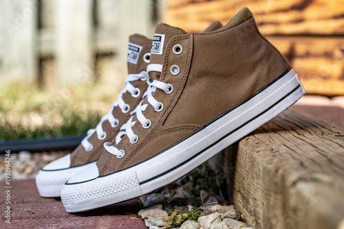 Obraz premium Brown Converse Chuck Taylor high top sneakers on wooden step outdoors