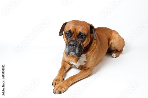 © BartLoveyou, Obraz premium brown cute German boxer dog lies on a white background
