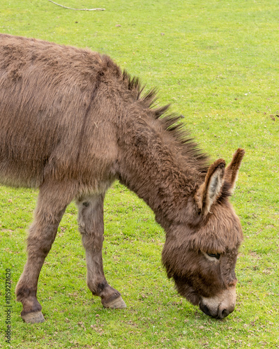 © Ulrich, Fototapeta premium Brown donkey grazing on green grass in a sunny field during the afternoon