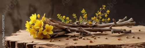 Fototapeta premium Brown dried Acacia leaves and twig on a wooden stump with yellow flower buds,...