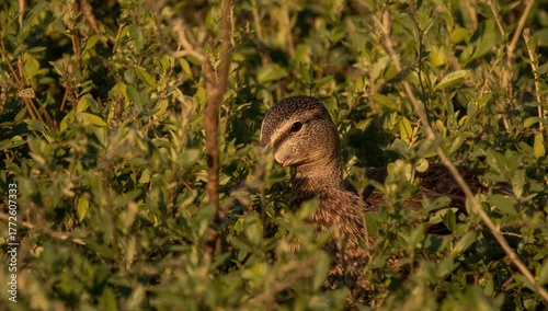 Obraz premium Brown duck concealed among foliage on a bright day, focus on camouflage