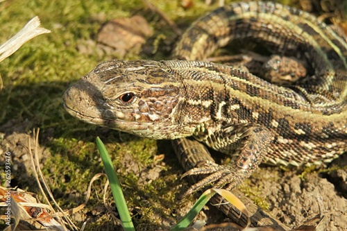 Naklejka premium Brown european lizard on ground in the garden, closeup