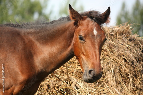© virgonira, Fototapeta premium Brown foal eating dry hay in summer
