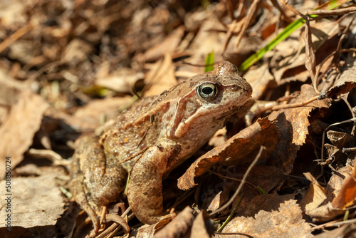 © JaneMoon, Fototapeta premium brown frog in dry leaves