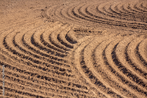 Naklejka premium brown ground plowed field, harrow lines. Arable background. Pattern of curved ridges and furrows in a humic sandy field. A freshly ploughed field showing a geometric pattern of shadows in the furrows