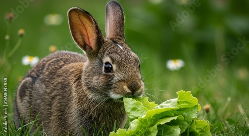 Fototapeta premium Brown hare munching fresh lettuce amidst a lush green meadow scenery