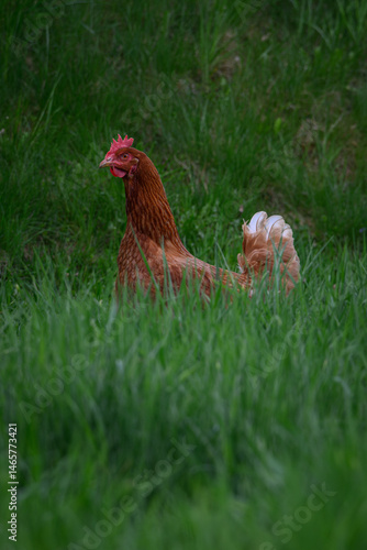 Fototapeta premium Brown hen in tall green grass.