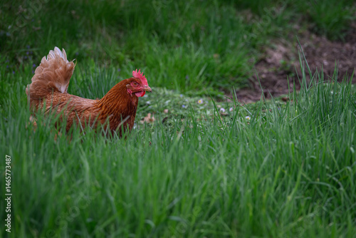 © lapis2380, Fototapeta premium Brown hen in tall green grass.
