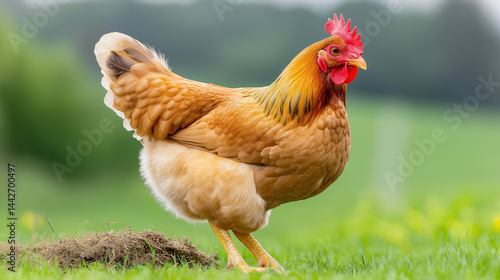 © Edhar, Fototapeta premium Brown hen walking on grass in a lush green farm setting