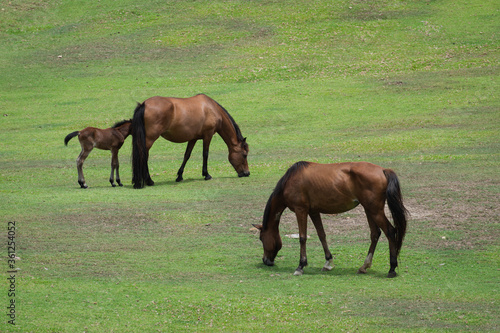 © Phonpipat, Obraz premium Brown horse family are eating grass in the vast grass area.